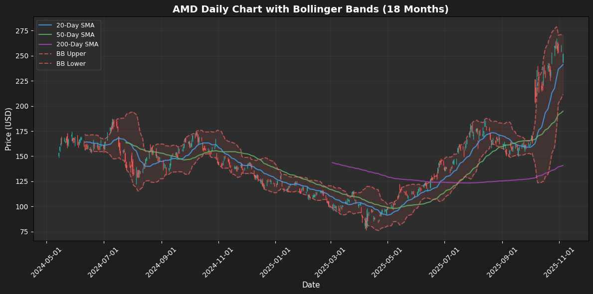 The current price of $251.18 indicates a strong upward momentum, significantly above the 20-day moving average (MA20) of $241.23, suggesting bullish short-term sentiment. Furthermore, the price is well above the 50-day (MA50) and 200-day moving averages (MA200) of $194.86 and $140.77, respectively, indicating a robust long-term trend.