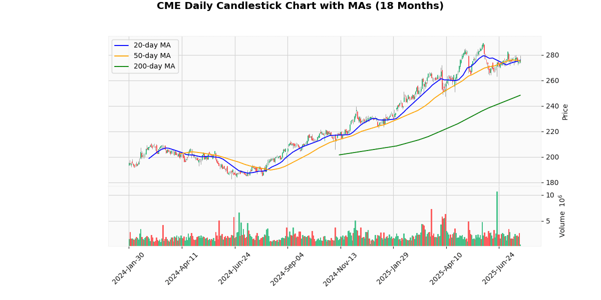 CME Group’s current price stands at $276.19, with a slight increase of 0.99%. The price is close to the week high of $279.44 but below the 52-week high of $289.46. The stock has been trading above its 20-day and 50-day moving averages by 0.14% and 0.3%, respectively. However, it is significantly above the 200-day moving average by 11.23%. The Relative Strength Index (RSI) at 51.99 indicates a neutral position. The Moving Average Convergence Divergence (MACD) of 0.39 suggests a bullish signal.
