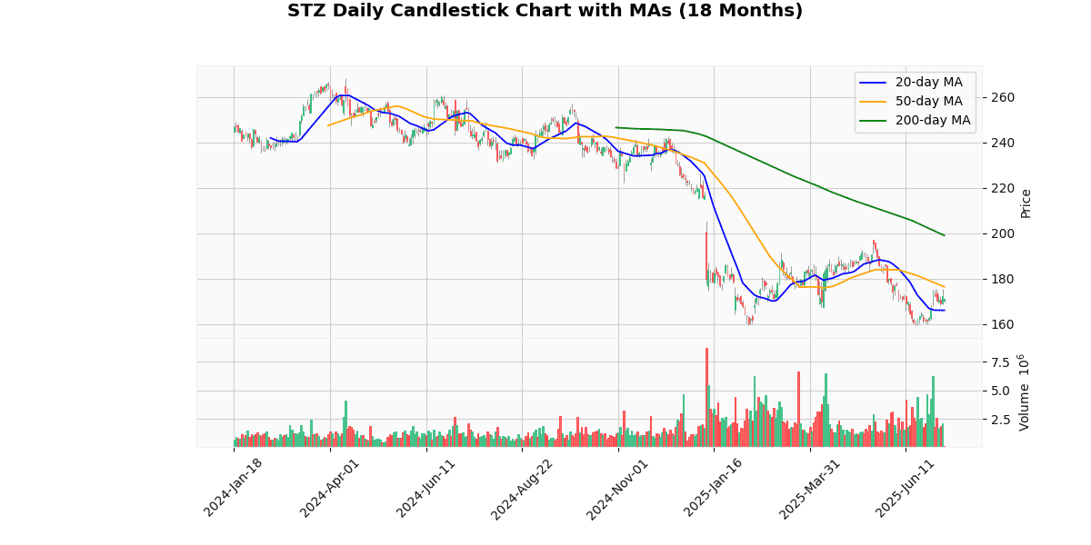 The current price of Constellation Brands stands at $171.18, showing a slight decrease. The stock is trading below its 20-day moving average by 3.09% but above the 50-day moving average by 2.95%. However, it is notably below the 200-day moving average by 13.97%. The 52-week high is at $259.25, representing a 33.97% difference, while the low is at $159.35, showing a 7.42% variance. The Relative Strength Index (RSI) is at 51.98, indicating a neutral position. The Moving Average Convergence Divergence (MACD) is -0.89, suggesting a bearish signal.