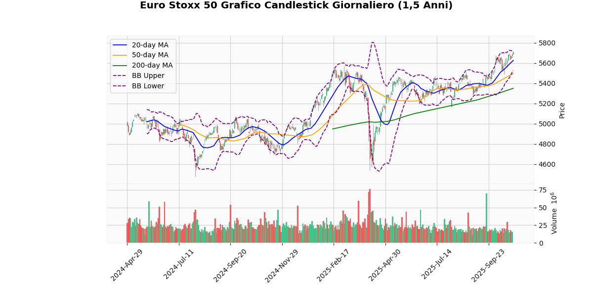 L’indice Euro Stoxx 50 mostra un trend rialzista nel breve termine, con il prezzo corrente che supera tutte le medie mobili (MA20, MA50, MA200) e si avvicina alla resistenza dell’upper Bollinger Band e al massimo annuale a 5712.78. Il sentiment di mercato è positivo, supportato da un RSI di 63.7 che indica una forza relativa e un MACD sopra il segnale, confermando la tendenza al rialzo. I livelli di supporto chiave sono rappresentati dalle medie mobili, in particolare MA20 a 5625.08.