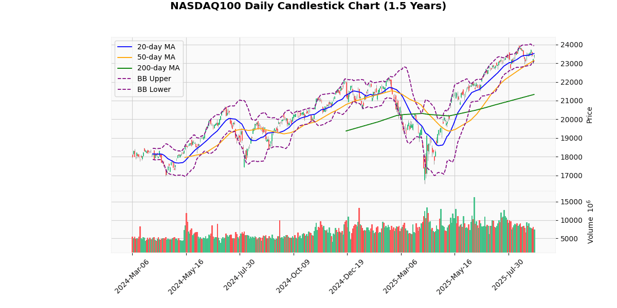 The NASDAQ100 index is currently priced at 23,414.84, showing a modest increase of 0.79% today. The index is trading below its 20-day moving average (MA20) of 23,517.28 but above its 50-day (MA50) and 200-day (MA200) moving averages, which are 23,143.51 and 21,327.77, respectively. This positioning indicates a short-term consolidation but a stronger upward trend in the medium to long term.