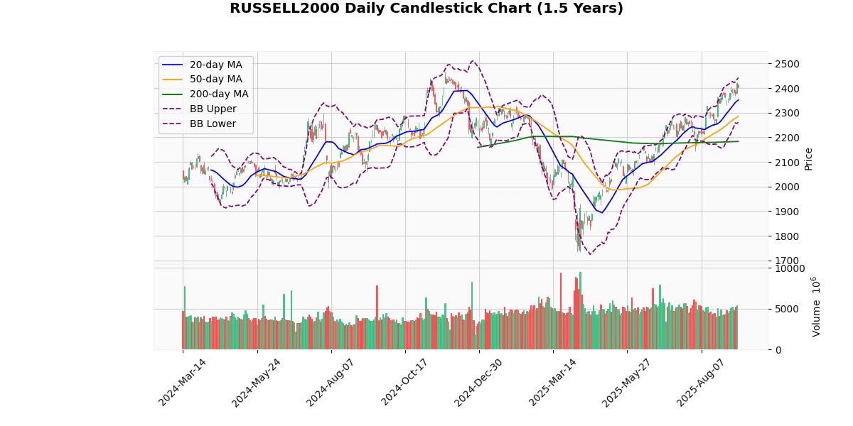In summary, the Russell 2000 is exhibiting strong bullish signals across several indicators, with the MACD and position relative to moving averages suggesting continued upward momentum. However, traders should watch the Bollinger Bands and RSI closely for signs of potential overbought conditions that could precede a pullback.